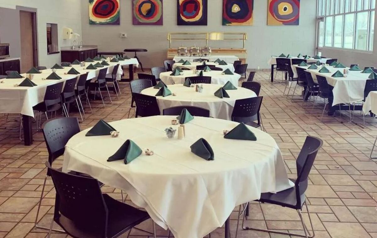 The facility includes various amenities like a library, school, and cafeteria.